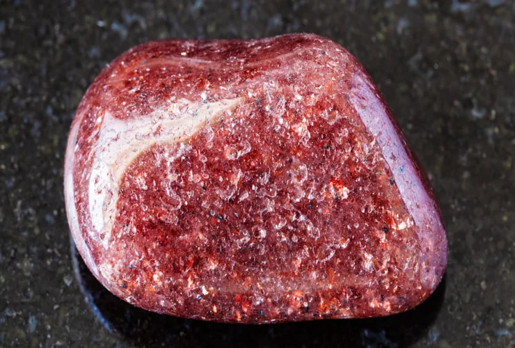 Aventurina vermelha: Com presença de hematita ou ferro, emana energia e vitalidade, ajudando a recuperar confiança e autoestima.